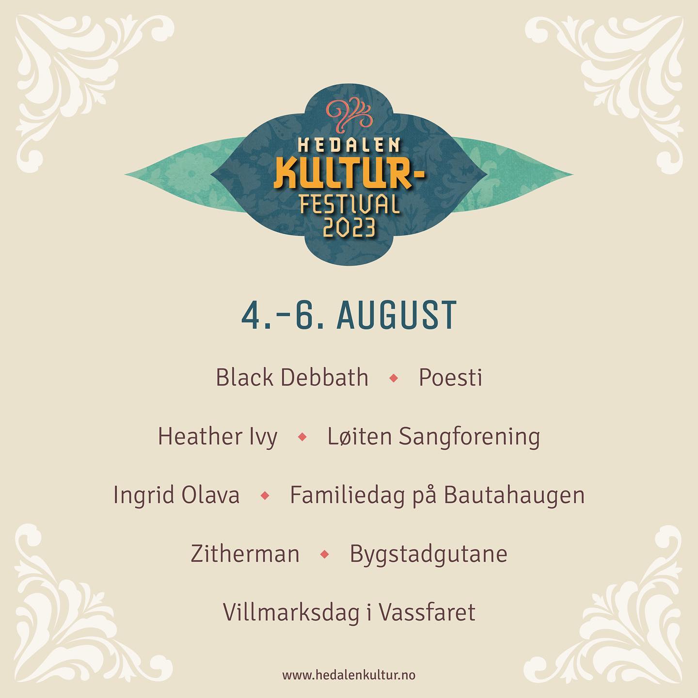 Få med deg årets kulturfestival i Hedalen. Her kan du få med deg Ingrid Olava i Hedalen Stavkirke, familiedag på Bautahaugen, Bygstadgutane, Zitherman, Heather Ivy, Black Debbath, Poesti over Hedalsfjella og Villmarksdag i Vassfaret.